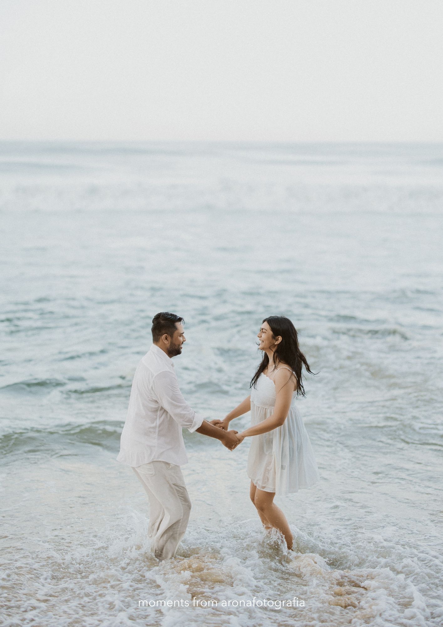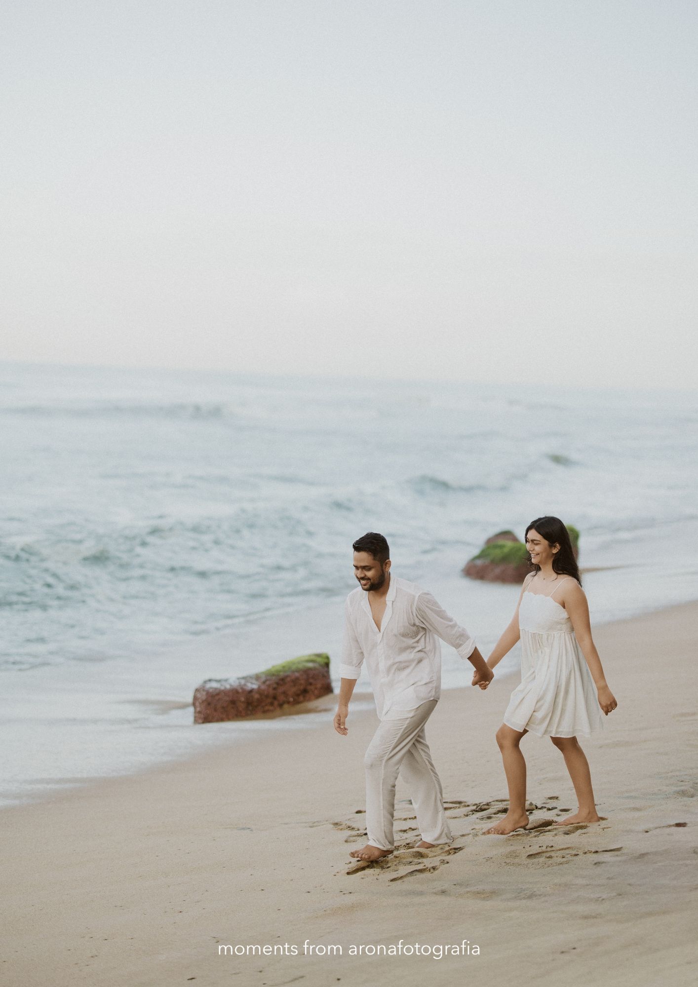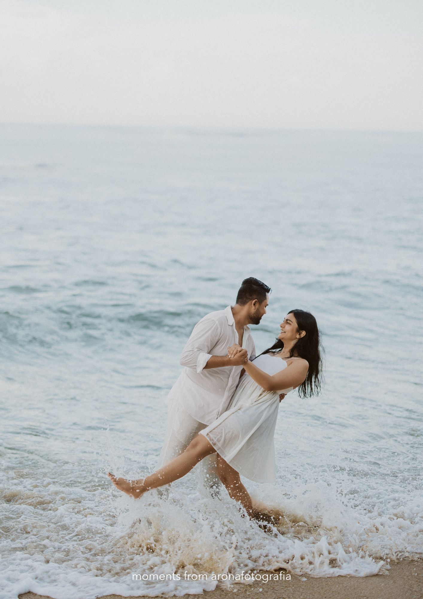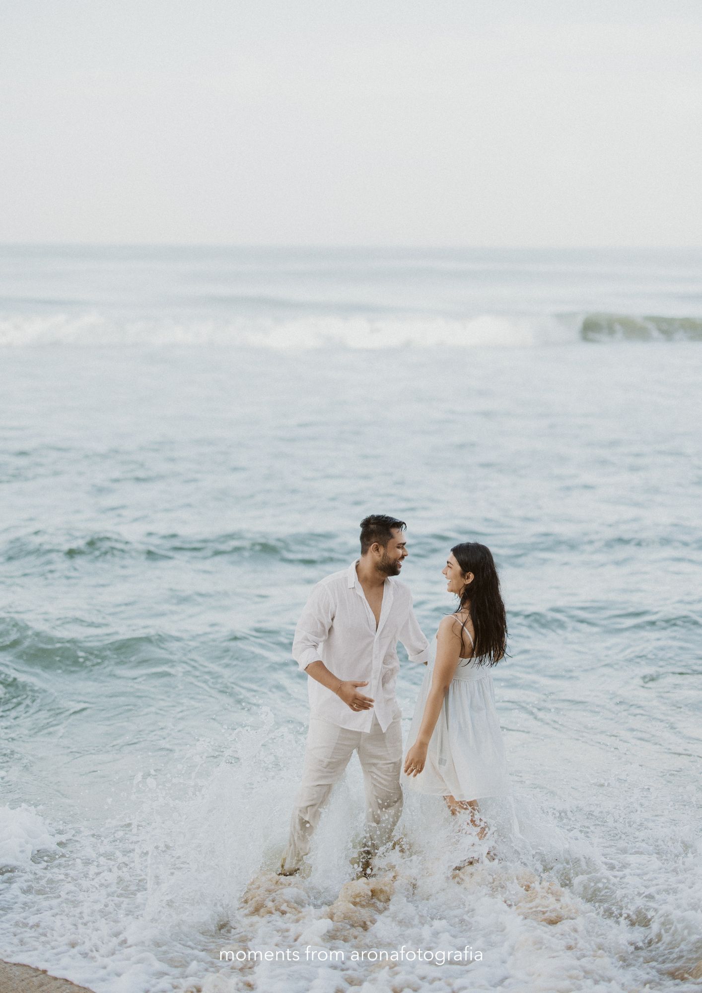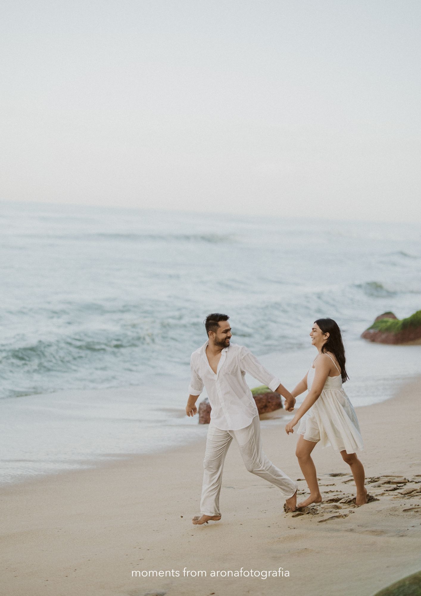 Saharsh and Rishika’s pre-wedding shoot beautifully captured the charm of love, laughter, and togetherness at the stunning Varkala Beach in Kerala. Shot during the early morning hours, the soft golden light and calm waves created a dreamy, romantic atmosphere. Dressed in breezy outfits that matched the beach vibe, the couple radiated pure joy and connection as they enjoyed every candid moment by the shore. The combination of natural light, ocean breeze, and their effortless chemistry made every frame come alive. This beach pre-wedding shoot in Kerala perfectly blends fun, freedom, and romance a beautiful visual story captured by Arona Fotografia, one of the best pre-wedding photographers in Kerala.