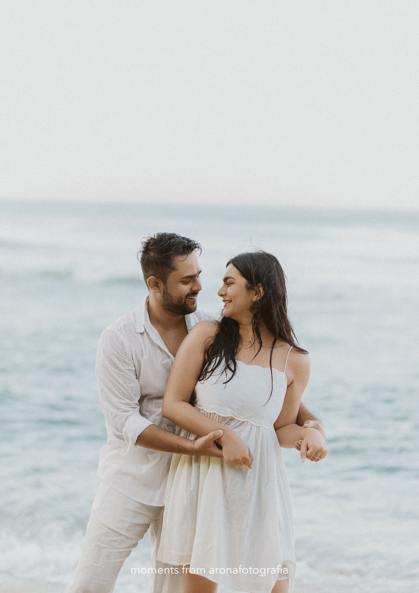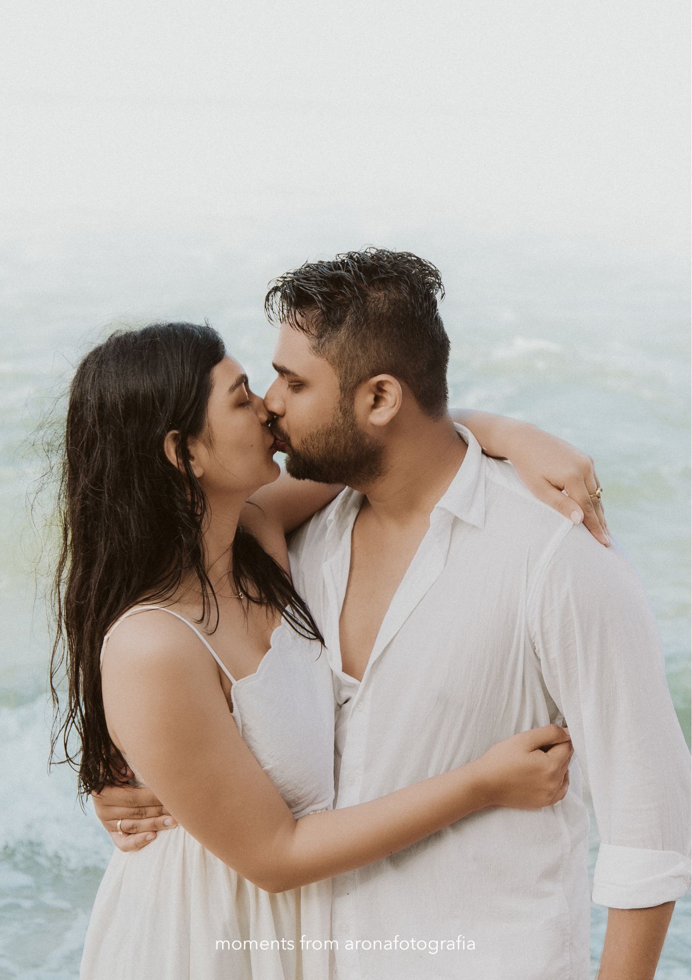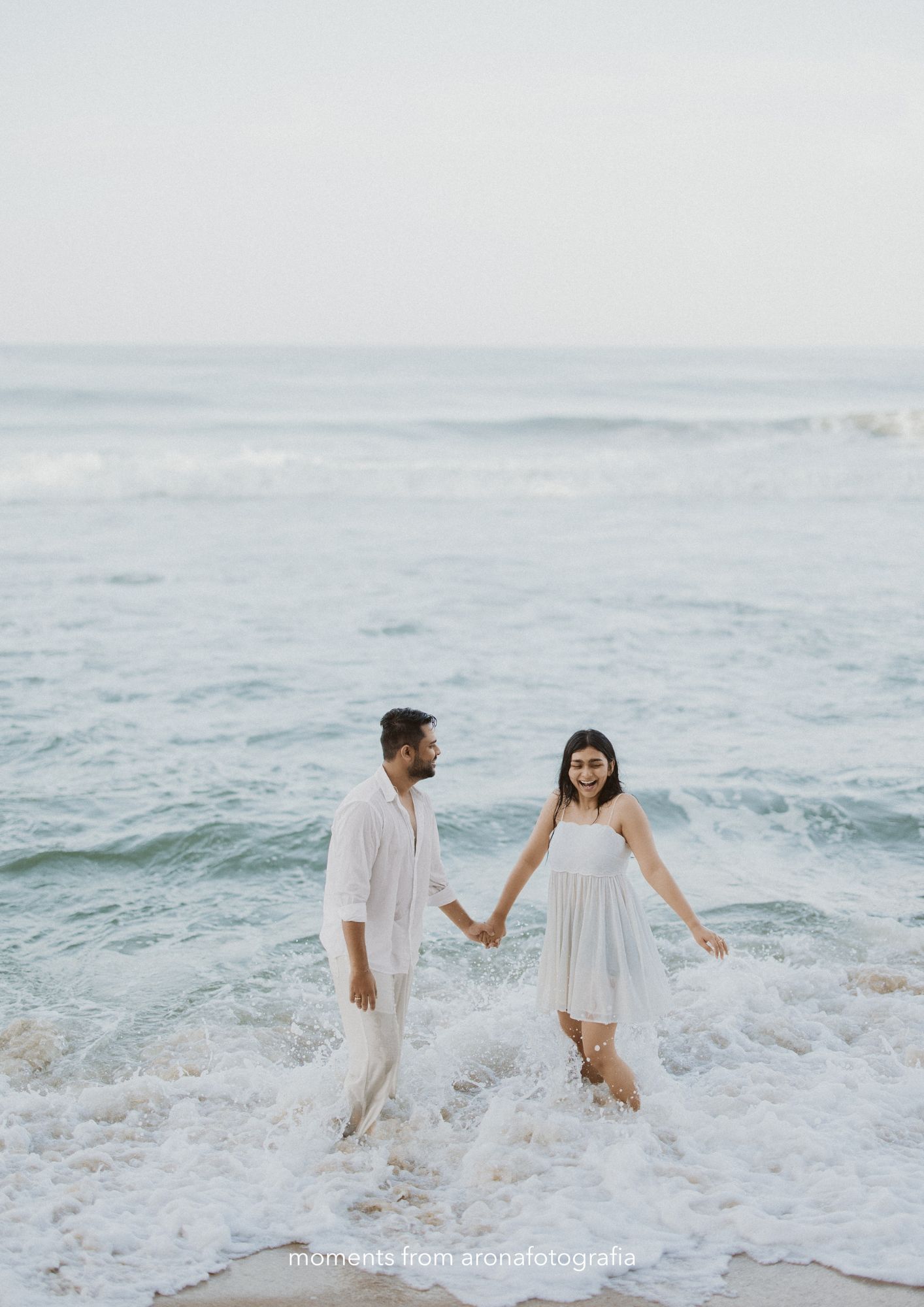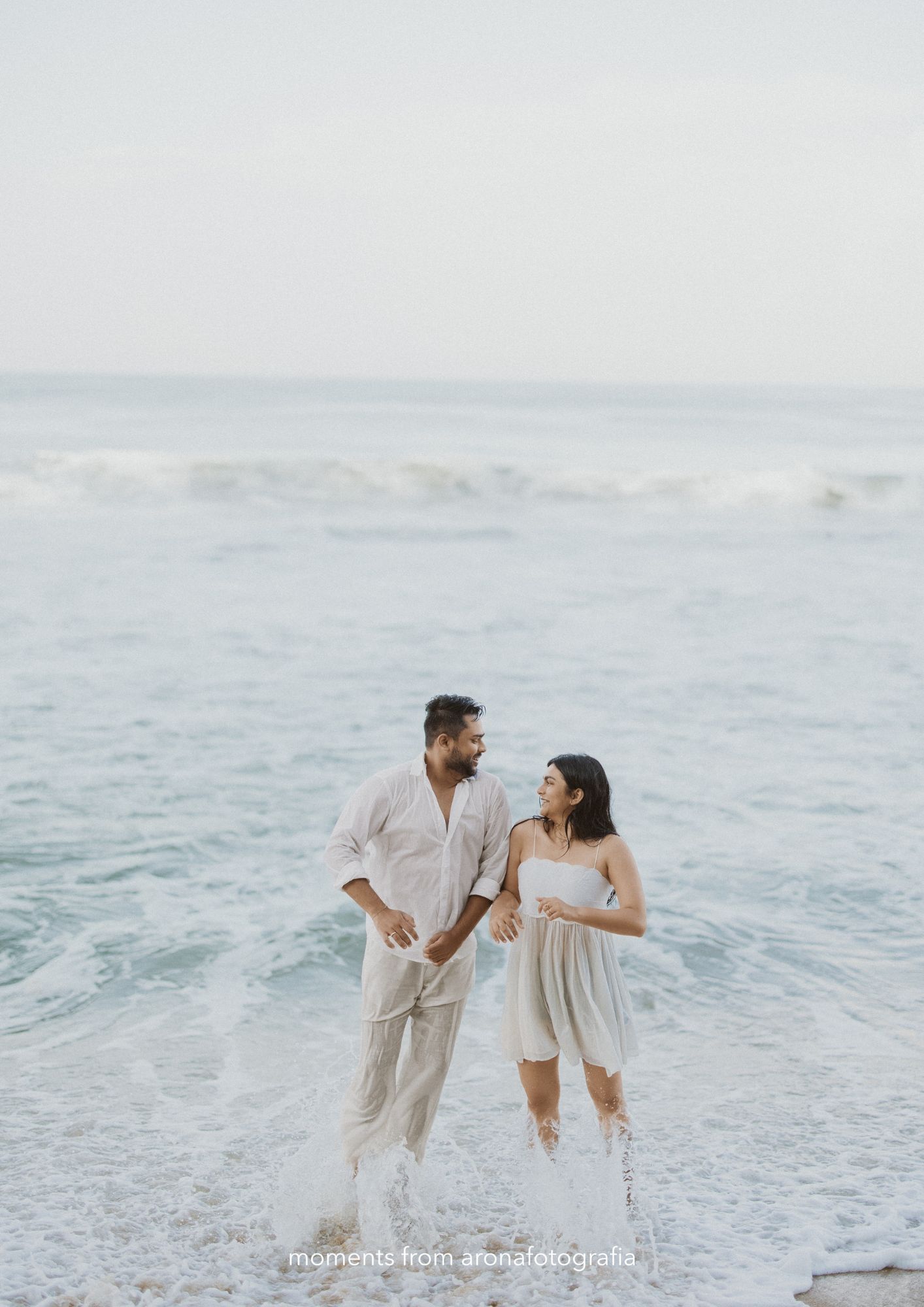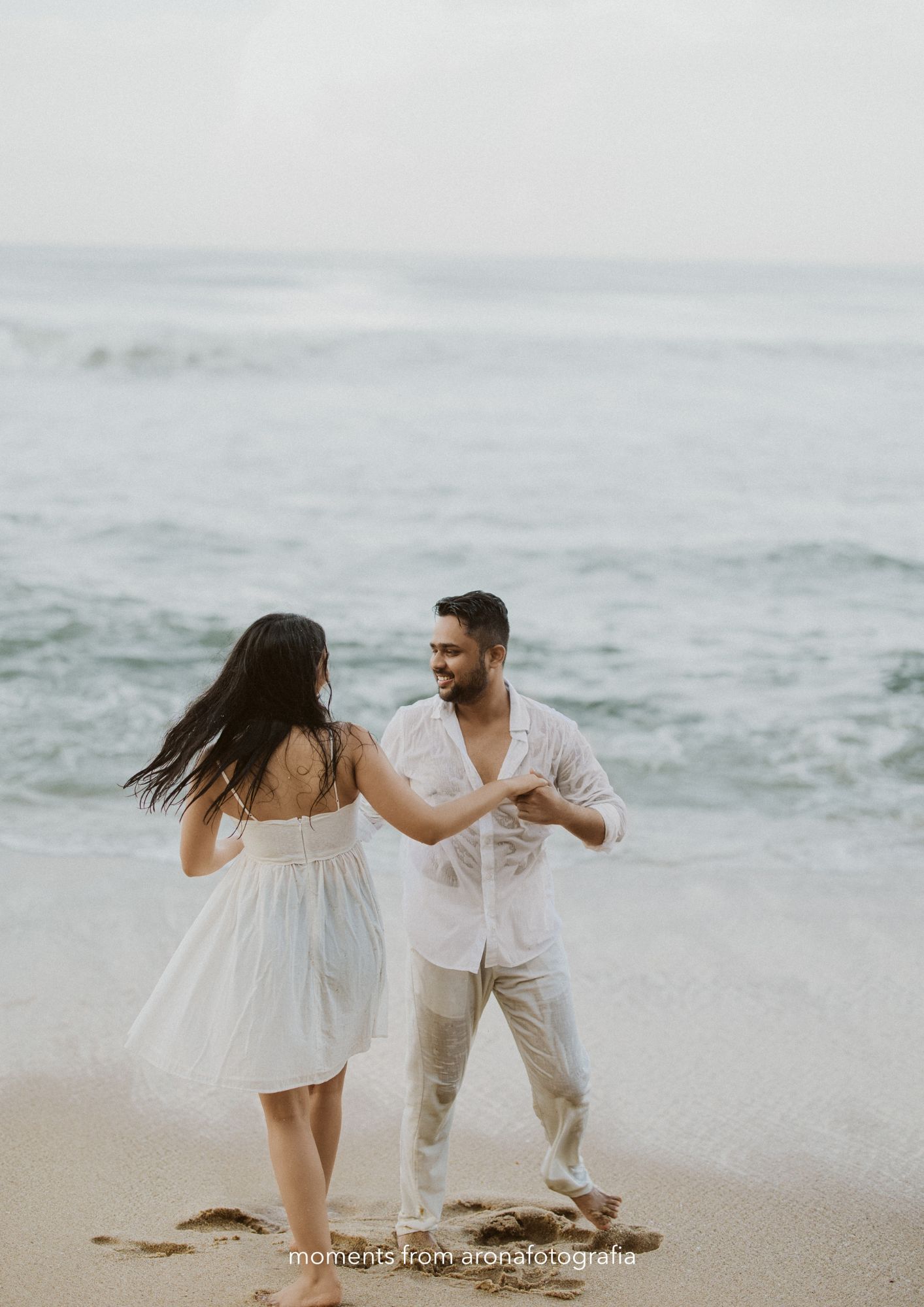Saharsh and Rishika’s pre-wedding shoot beautifully captured the charm of love, laughter, and togetherness at the stunning Varkala Beach in Kerala. Shot during the early morning hours, the soft golden light and calm waves created a dreamy, romantic atmosphere. Dressed in breezy outfits that matched the beach vibe, the couple radiated pure joy and connection as they enjoyed every candid moment by the shore. The combination of natural light, ocean breeze, and their effortless chemistry made every frame come alive. This beach pre-wedding shoot in Kerala perfectly blends fun, freedom, and romance a beautiful visual story captured by Arona Fotografia, one of the best pre-wedding photographers in Kerala.